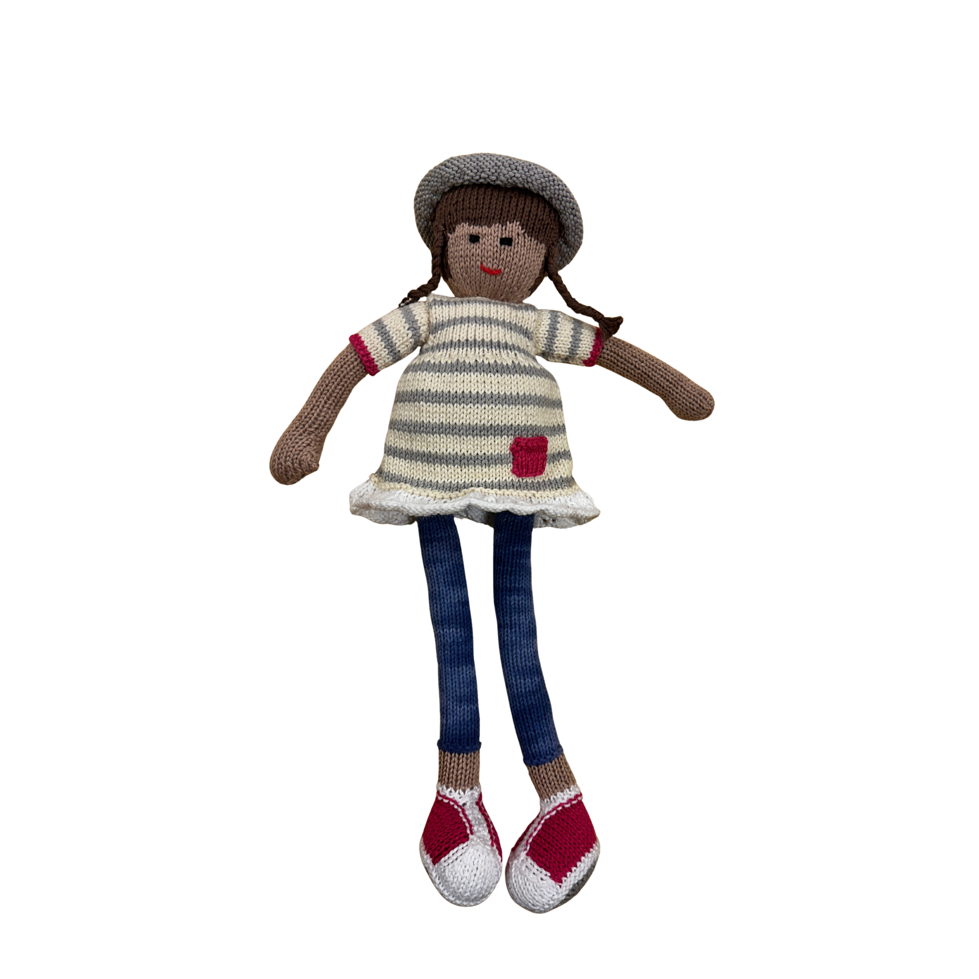 Vinkona sem allir vilja eiga.  Í röndóttum kjól og strigakóm í stíl.  Handprjónað úr bómull.  Stærð 40 cm.