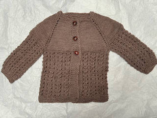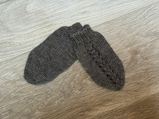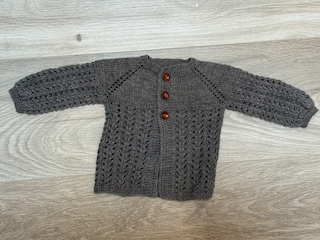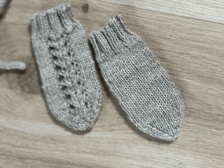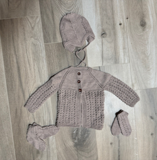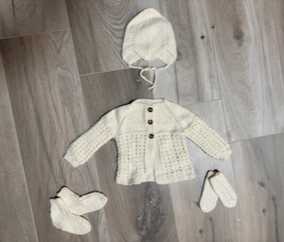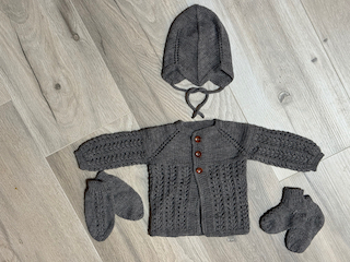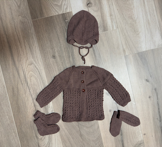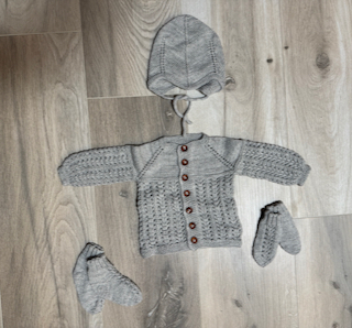 Húfa án dúsks (hægt að panta hann sér), hneppt peysa, sokkar og vettlingar.