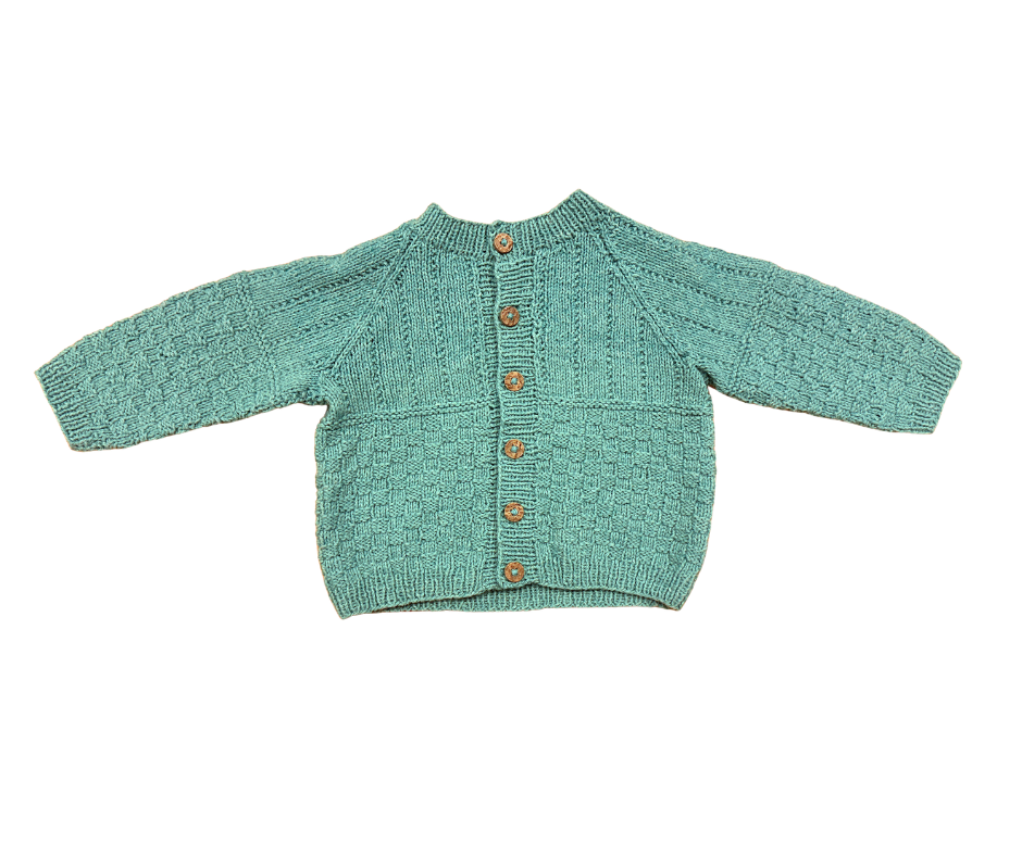 Hneppt peysa með skemmtilegu mynsturprjóni.  Mælt með handþvotti.  Stærð 3-6 mánaða.