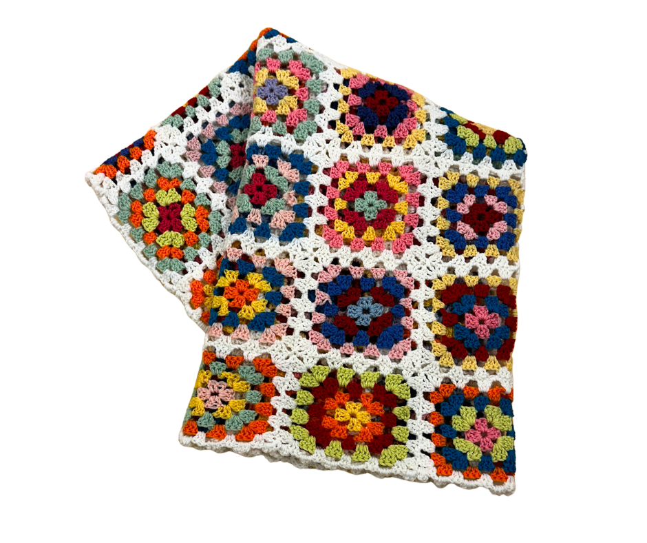 Heklað ullarteppi úr ömmudúllum. Litríkt og glaðlegt. Stærð 104 x 66 cm.
